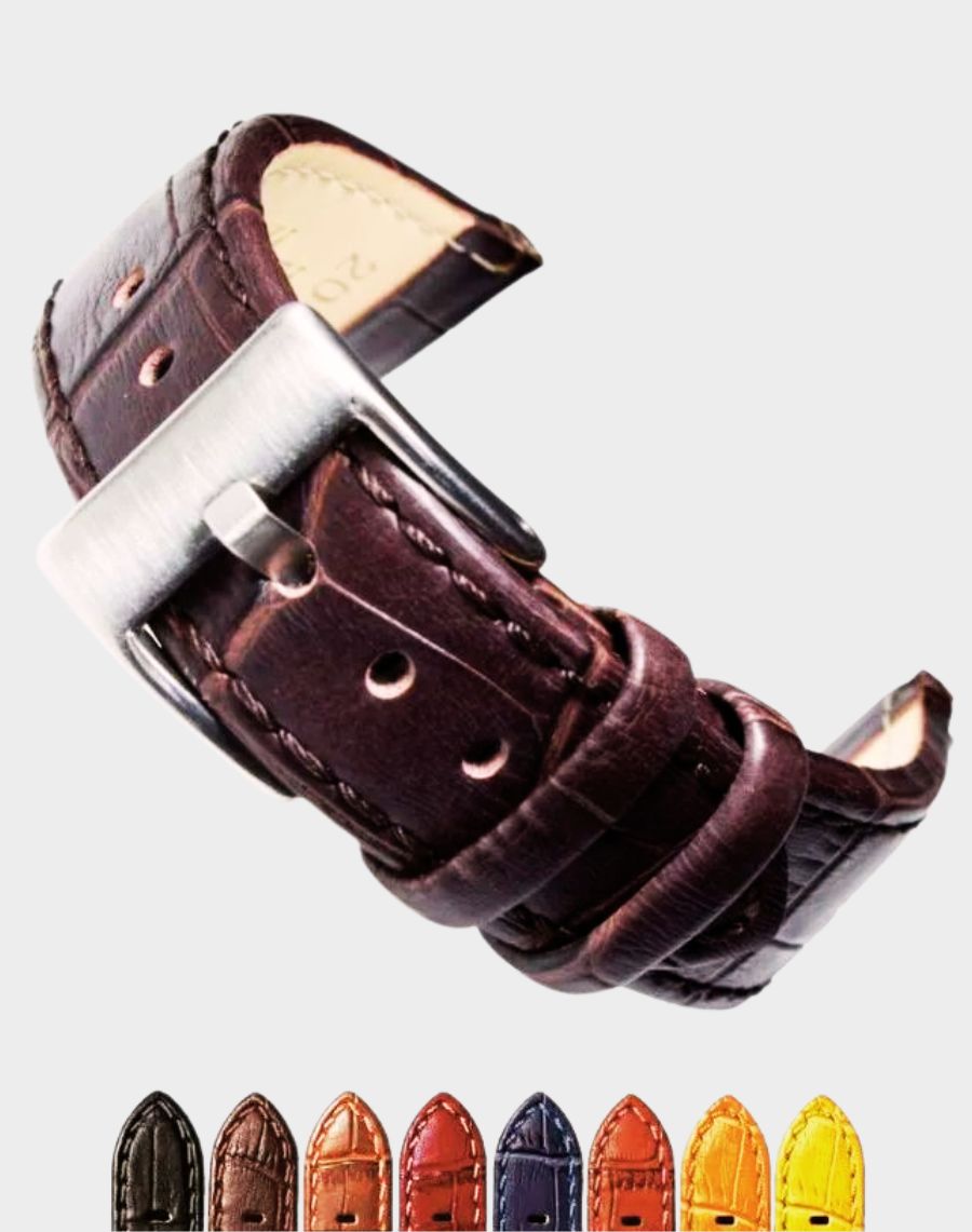 W przypadku skórzanych pasków do zegarków, pracujemy głównie ze skórą bydlęcą z różnymi wzorami (krokodyla, bizona, jaszczurki itp.), choć wykorzystujemy również niewielką ilość skór egzotycznych, takich jak aligator czy jaszczurka. Zawsze stosujemy najwyższej jakości wykończenia i najsurowsze kontrole jakości. Jeśli szukasz skórzanych pasków do zegarków, znajdziesz je tutaj.