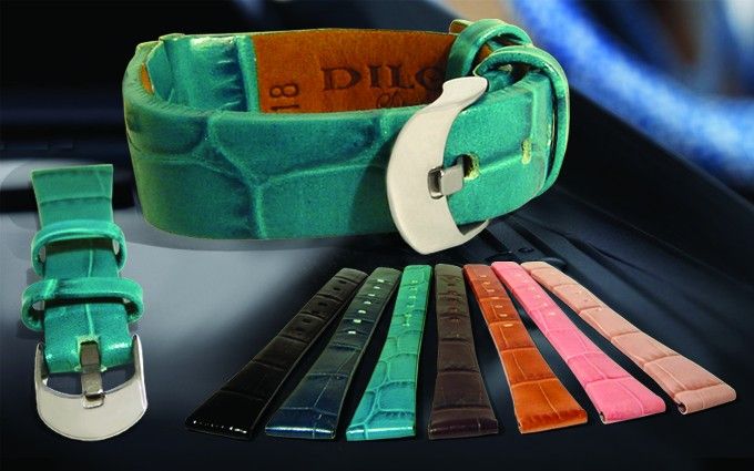 Pasek do zegarków wyprodukowano z włoskiej skóry krowiej, imitującej łuski aligatora.