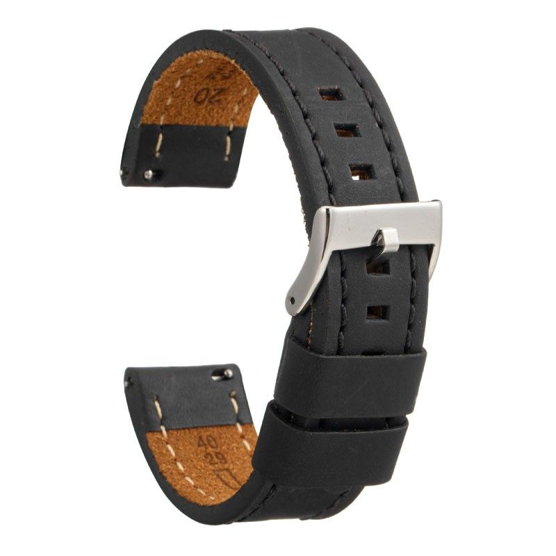 Skóra została zaimpregnowana naturalnym woskiem, co nadaje jej trwałość oraz patynę, która z czasem nabiera charakteru. Pasek dostępny jest w szerokościach 18mm, 20mm, 22mm i 24mm, pasuje do większości zegarków z prostym mocowaniem teleskopowym. Dostępne kolory to czarny, jasnobrązowy i ciemnobrązowy — doskonałe do zegarków sportowych, klasycznych i codziennych.