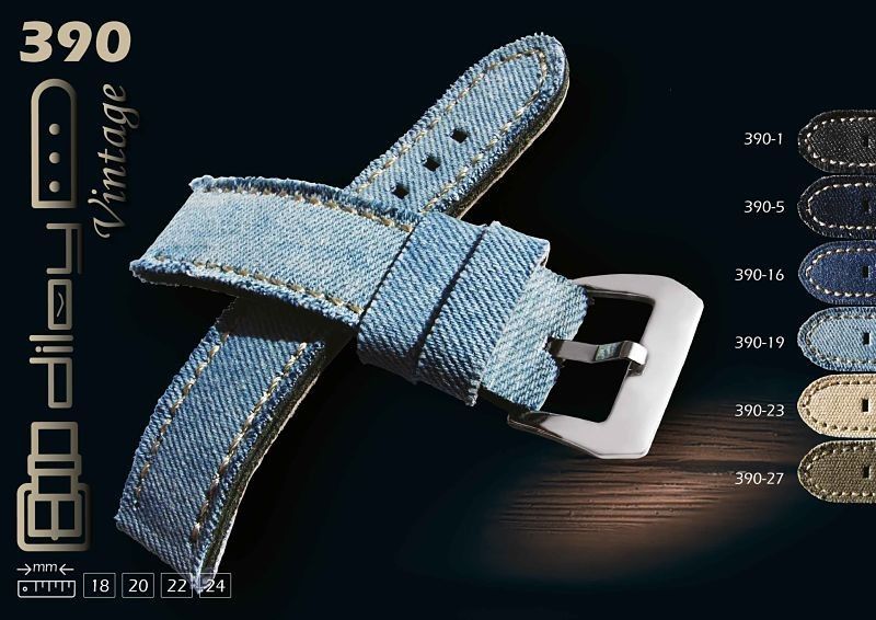 Pasek Diloy 390 łączy styl casual, sportowy i miejski z wytrzymałością postrzępionej tkaniny jeansowej i komfortem podszycia ze skóry naturalnej. Dzięki płaskiemu, solidnemu i lekkiego profilowi doskonale nadaje się do zegarków sportowych, miejskich i na co dzień. Wyróżniający się postrzępionym wykończeniem denim nadaje każdemu zegarkowi świeży, oryginalny charakter w stylu vintage.