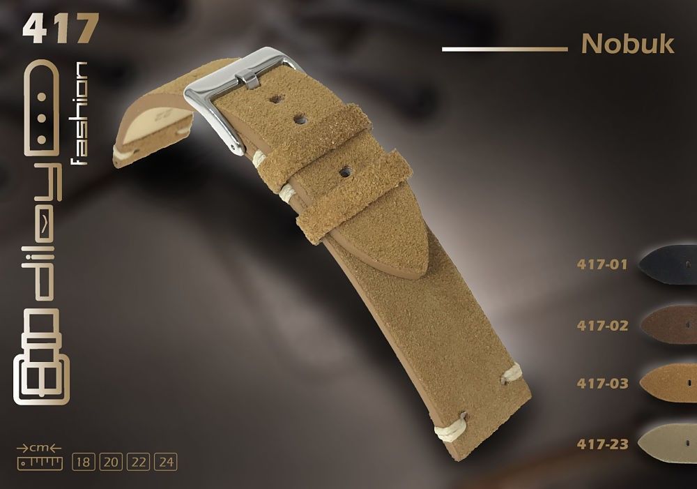 Pasek Diloy 417 łączy tradycyjne rzemiosło z klasycznym stylem vintage dla miłośników zegarków. Wykonany ręcznie z naturalnej skóry cielęcej typu nubuk lub zamsz, oferuje miękką fakturę, ciepły dotyk i retro wygląd, który z czasem nabiera charakteru. Każdy pasek jest unikalny dzięki ręcznej produkcji, dodając zegarkowi indywidualności.