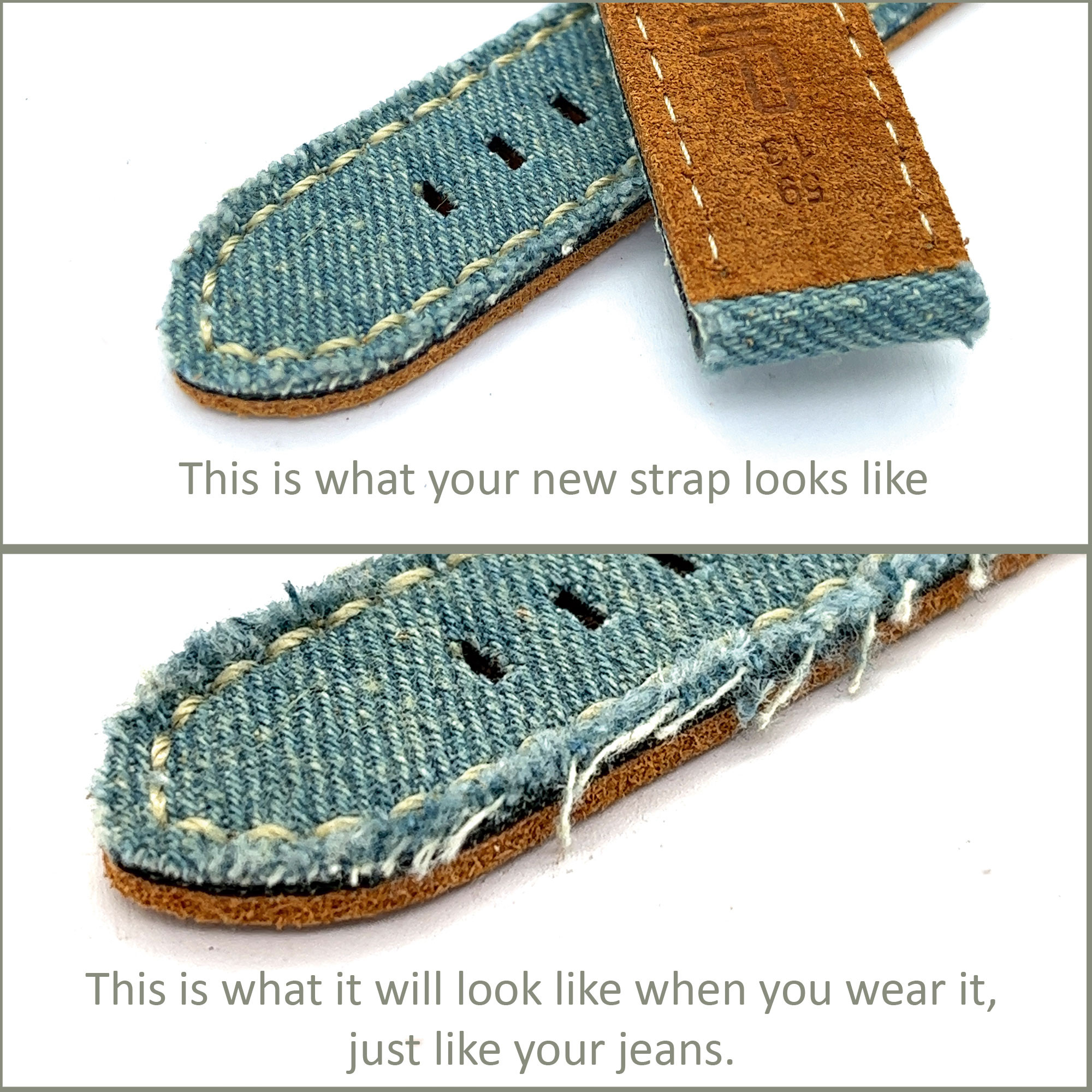 Pasek do zegarków wykonany z tkaniny jeans oraz skóry naturalnej.